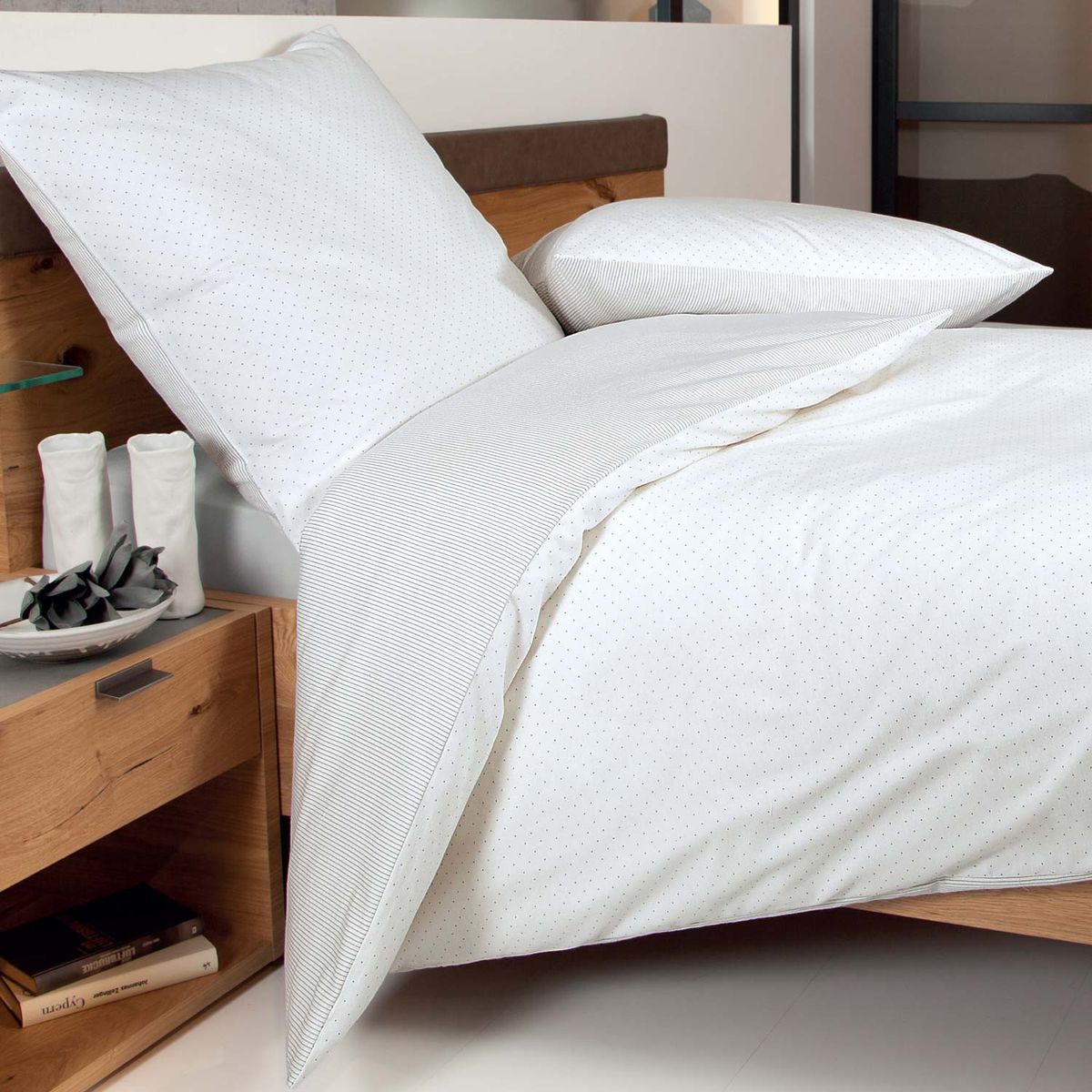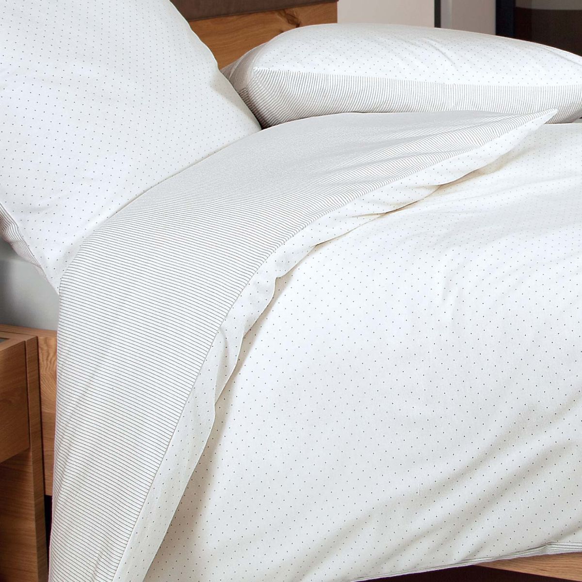 Kuschelweiche Wende-Winterbettwäsche Davos opalgrau von Janine. Schlichtes Dessin mit Pünktchen auf der einen Seite und Nadelstreifen auf der Wendeseite. Kuschelweiche, warme Biberbettwäsche aus 100 % Baumwolle, mit Reißverschluss.