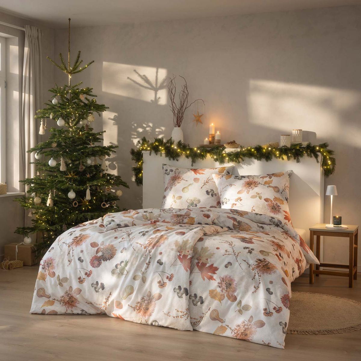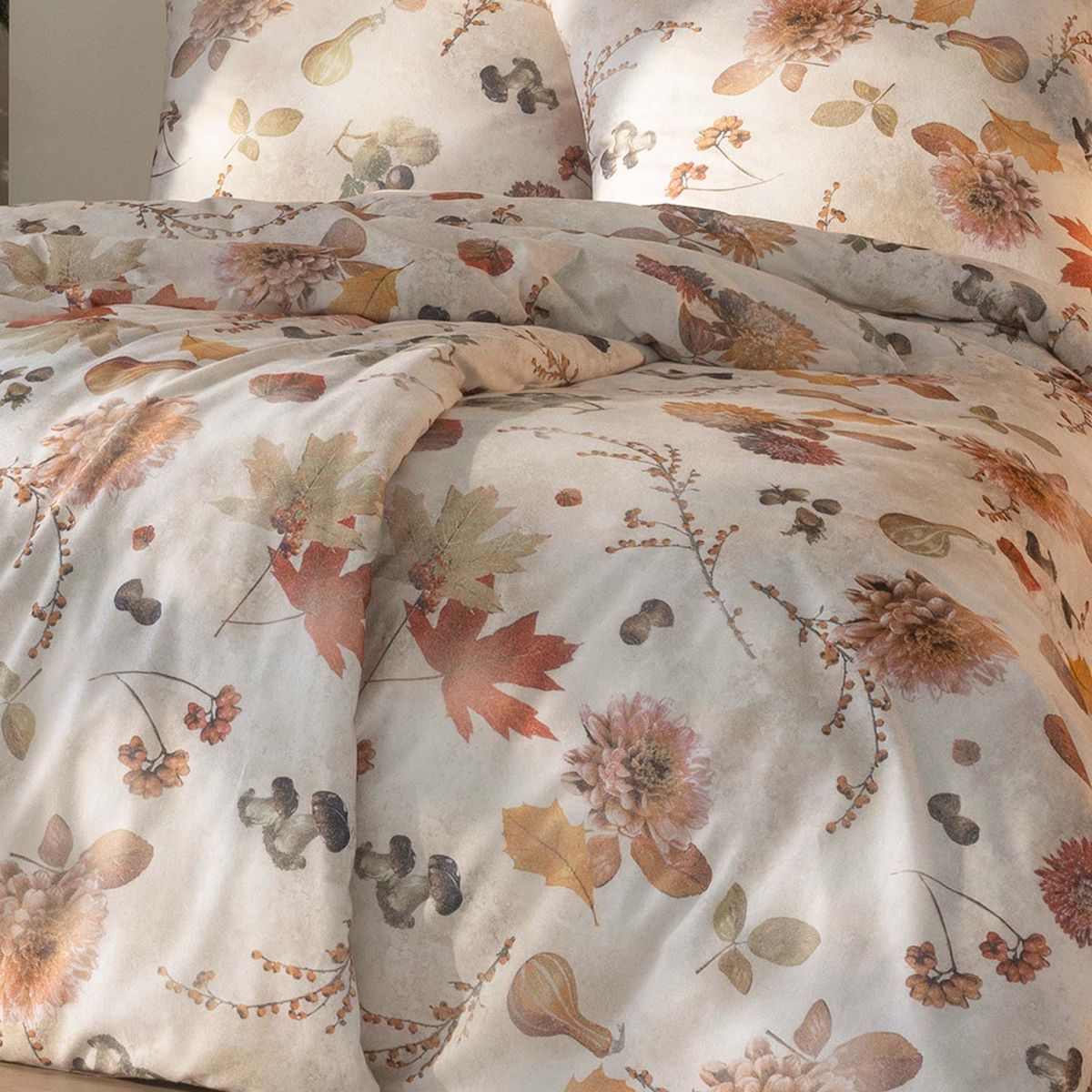 Kuschelweiche, warme Winterbettwäsche Estella Autumn foliage mit herbstlichem Dessin. Flanellbettwäsche aus 100 % Baumwolle, mit Reißverschluss.