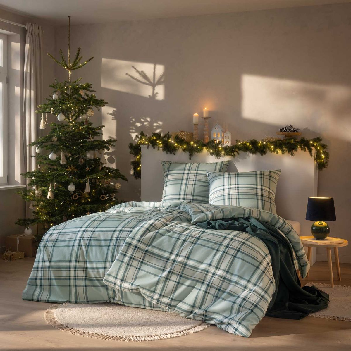 Die kuschelweiche Flanellbettwäsche hat ein klassisches Karomuster in sanftem Jadegrün, kombiniert mit frischem Weiß und tiefem Tannengrün. Schaffen Sie sich Ihre eigene Wohlfühloase und genießen Sie maximale Geborgenheit in den heimischen vier Wänden.