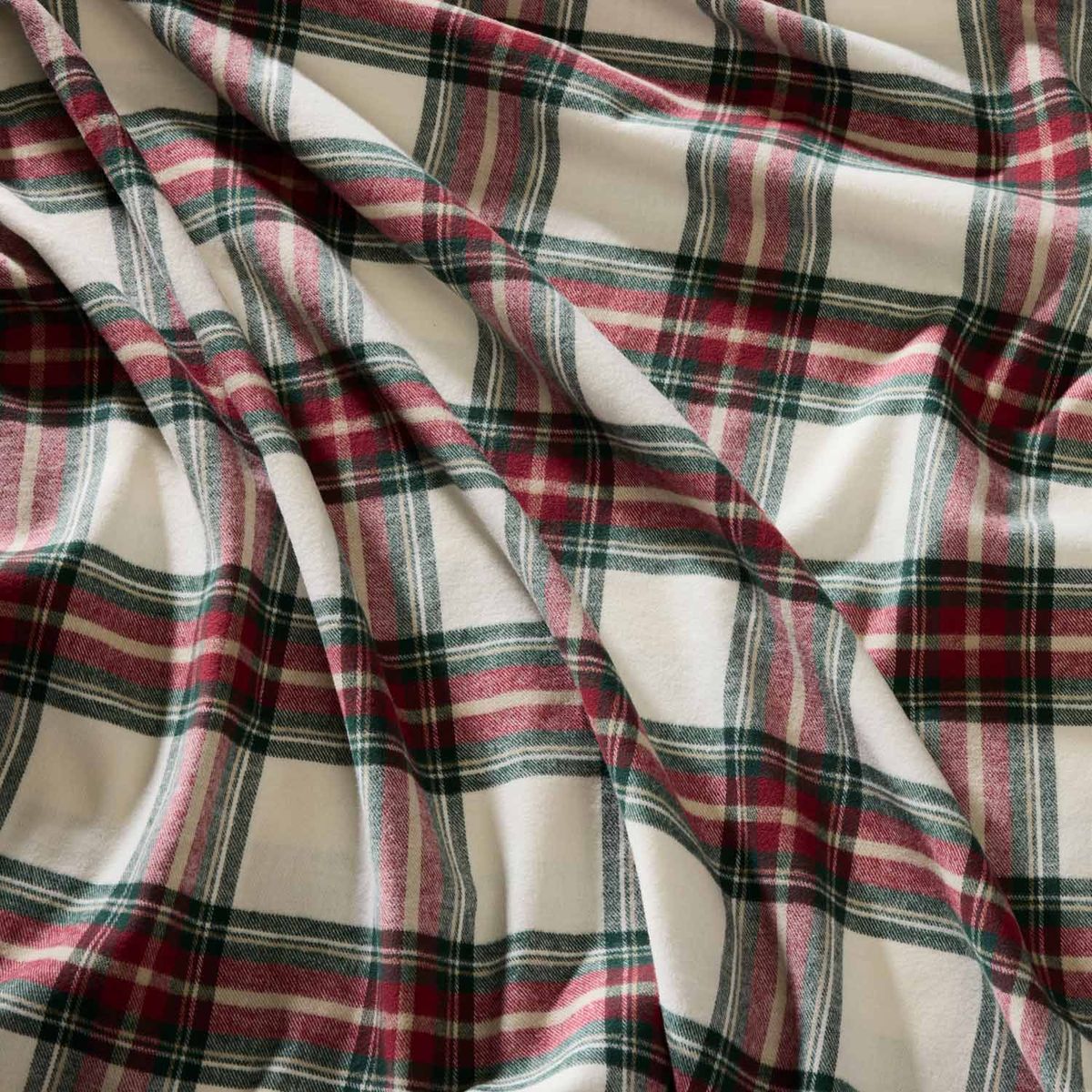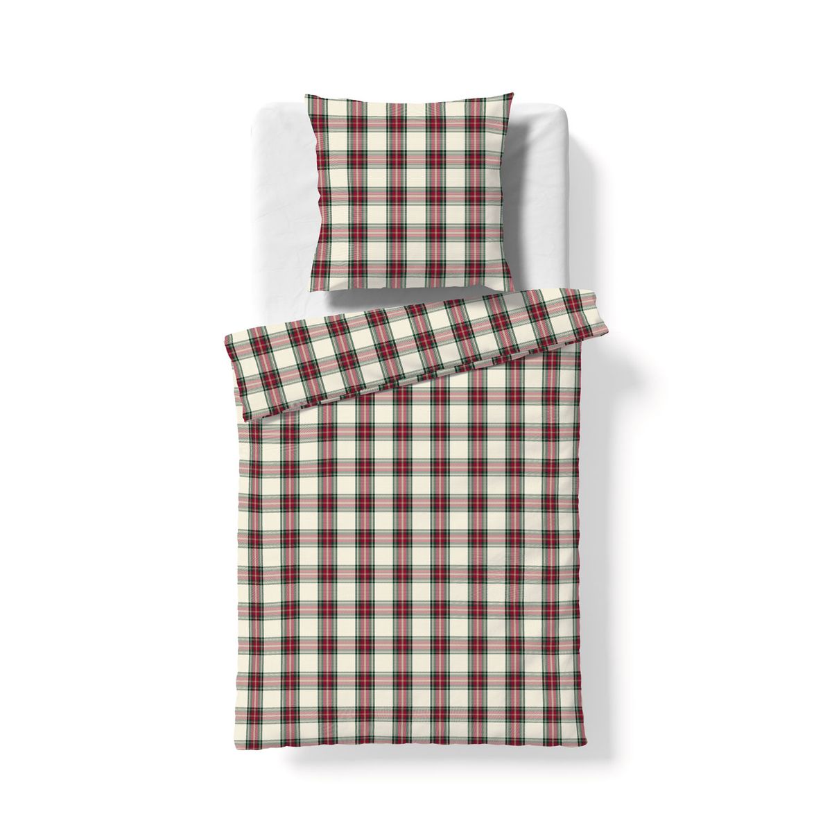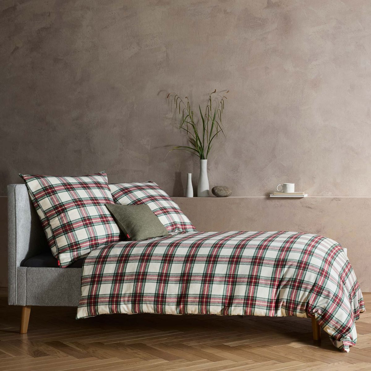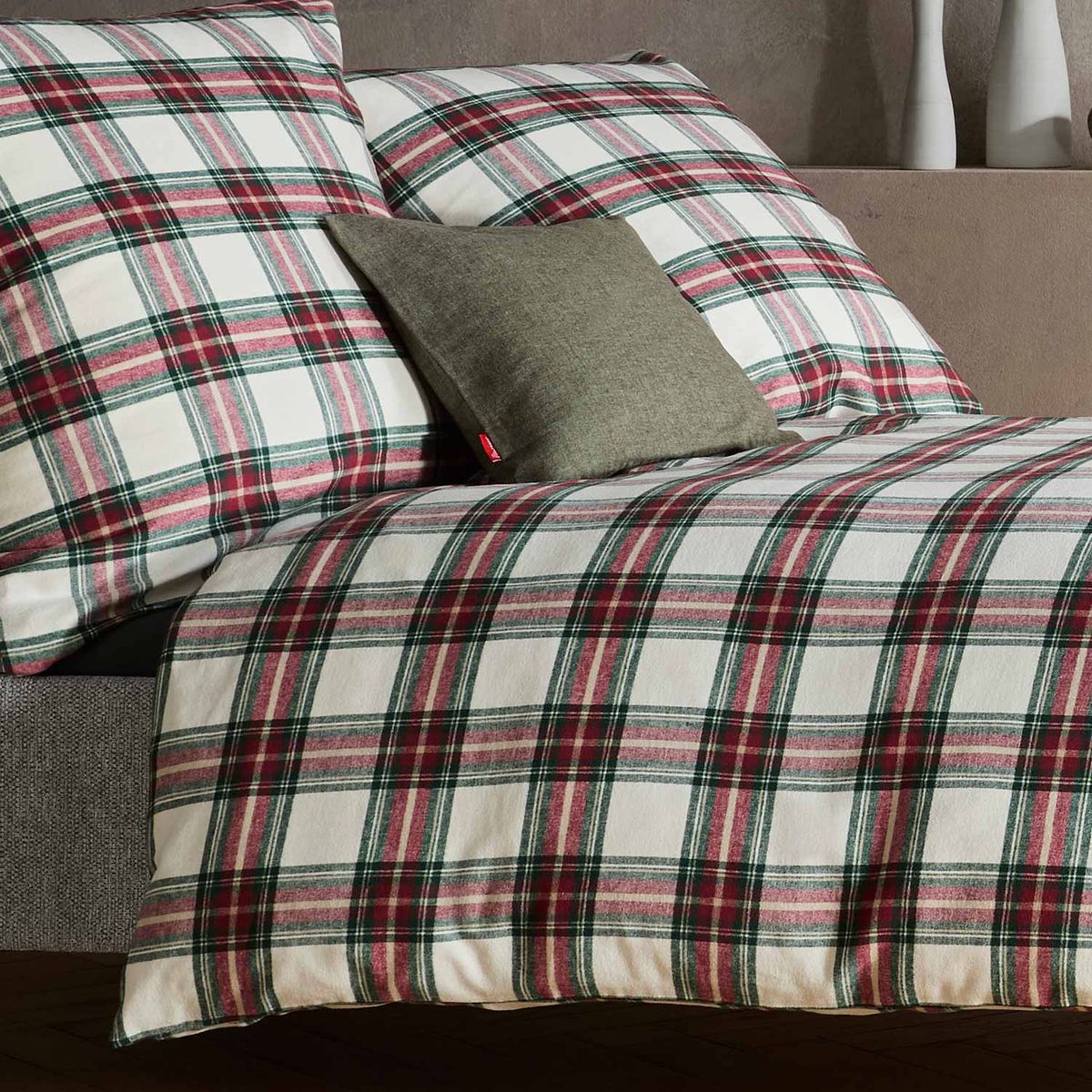 Grün-rot-beige karierte Flanellbettwäsche mit klassischem Karomuster. Zeitloses Dessin, kuschelweiche Qualität. Buntgewebter Flanell aus 100 % Baumwolle, mit Reißverschluss.