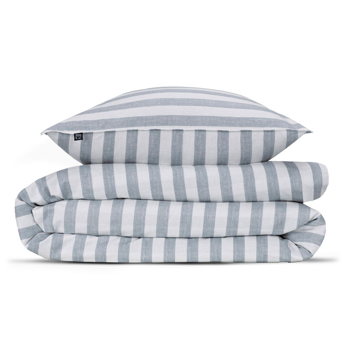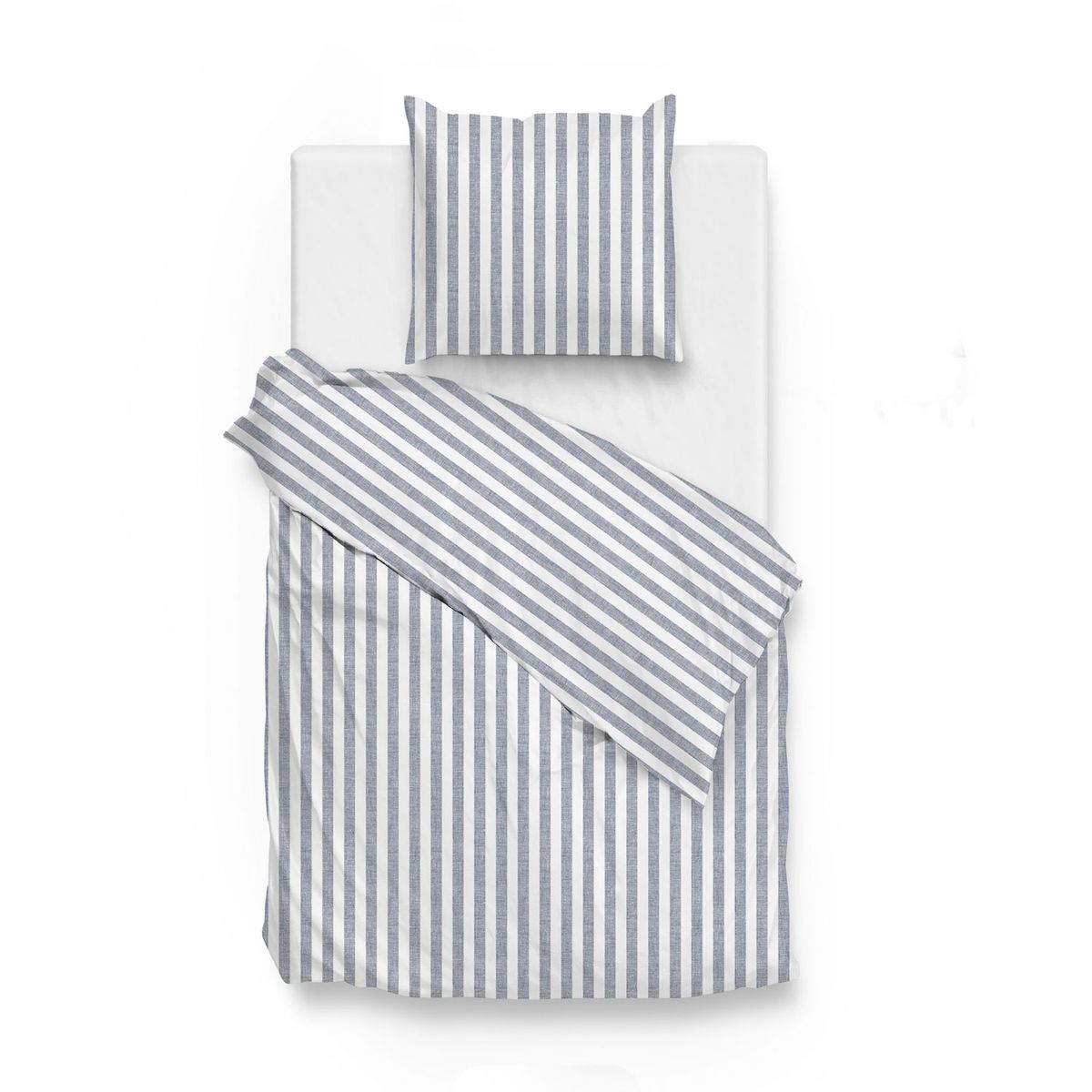 Die Bettwäsche ist aus hautfreundlicher Baumwolle gefertigt und liegt dank der Leinwandbindung luftig auf der Haut. Die Blockstreifen sind gedruckt.