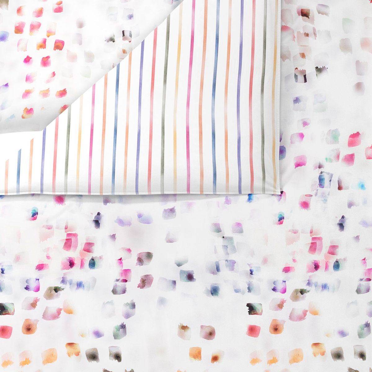 Farbenfroh zeigt sich die Mako-Satin Estella Bettwäsche Audrey. Aquarell-Punkte auf der Vorderseite und feine Streifen auf der Wendeseite sorgen für einen modernen, frischen Look mit grafischer Note.