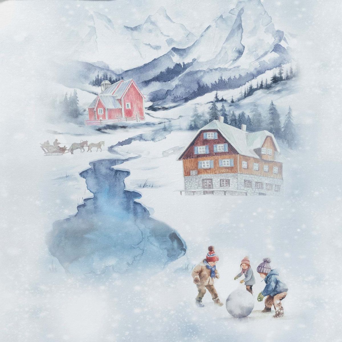 Mit der Wohndecke Mountain Lake hält der Winter Einzug in Ihr Zuhause. Das liebevoll gestaltete Aquarelldessin zeigt eine verschneite Berglandschaft mit charmanten Holzhäusern, Pferdeschlitten und spielenden Kindern - ein Wintermärchen zum Anfassen und Einkuscheln. Die Wendeseite ist in einem ruhigen Uni-Ton gehalten. Der Rand ist 4-seitig mit einer Kurbelnaht versehen und unterstreicht die erstklassige Verarbeitung.