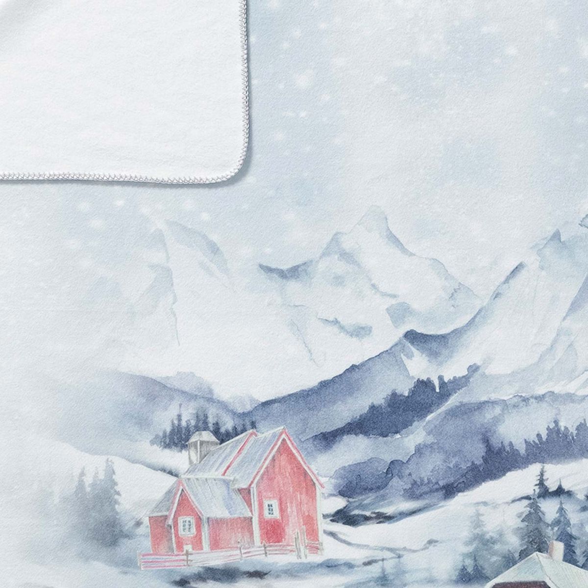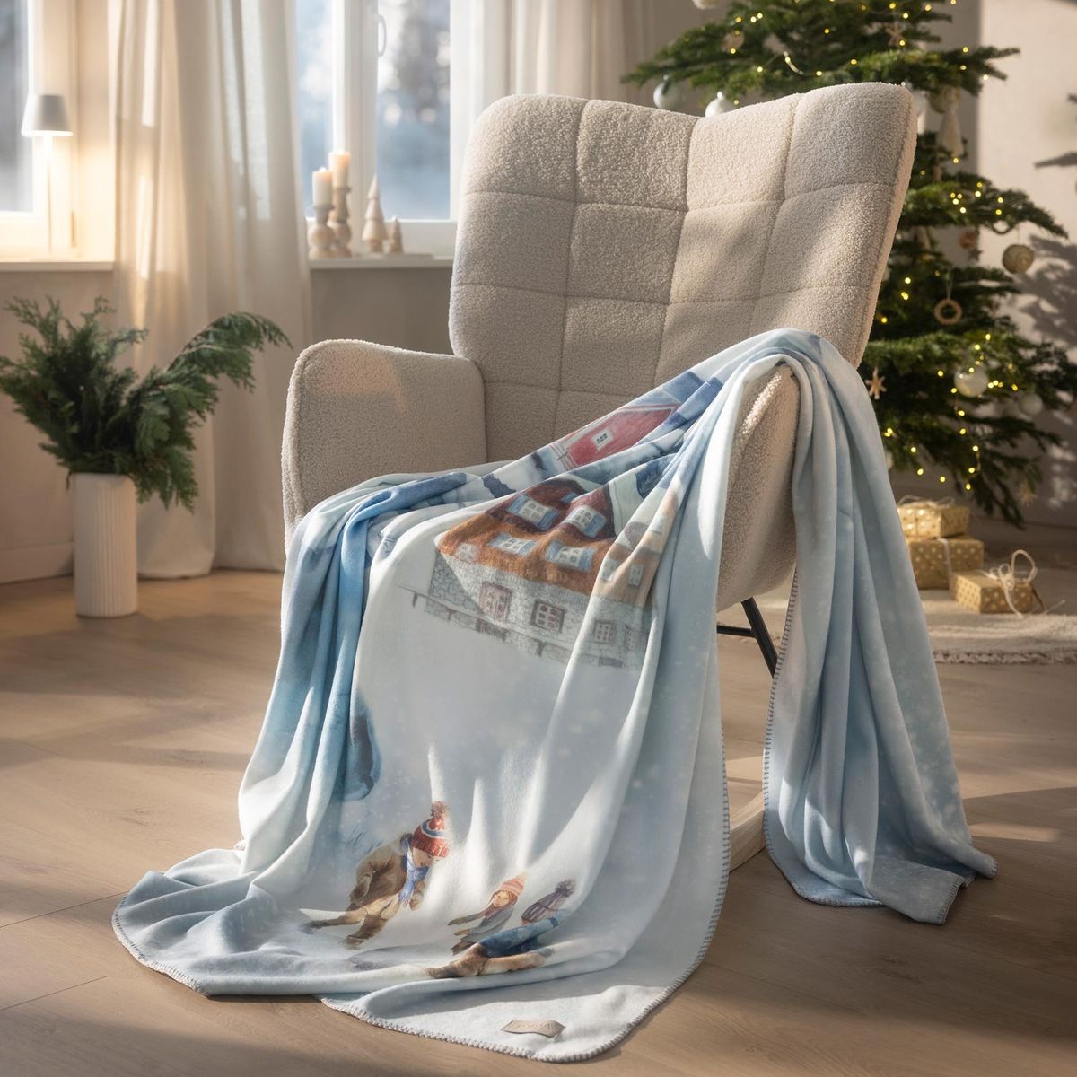 Pflegeleichte, flauschige Wohndecke aus Kuschelfeece mit Kurbelnaht. Winterliches Aquarelldesign mit Nostalgieflair