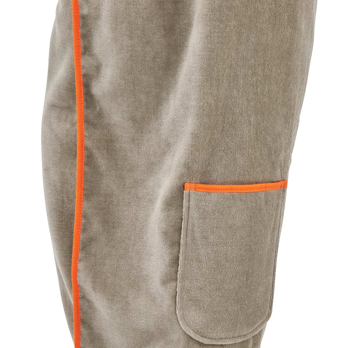 Dieser Kilt mit auffällig farbigem Saum ist aus 100% Baumwolle. Er hat eine extra weiche Velour Außenseite und eine saugstarke Frottier Innenseite. Gehalten wird er mit Klettverschluss und im Rand ist eine