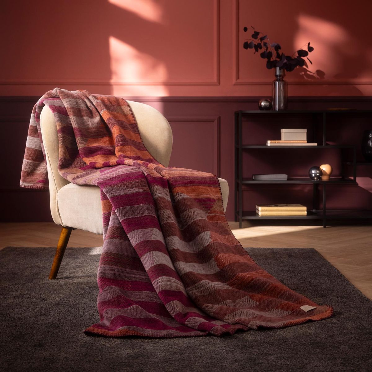 Warme Rottöne, kombiniert mit Violett und Blau, bestimmen das geometrische Design schönen Wohndecke. Die Wohndecke ist super-weich und schmiegt sich wunderbar an Ihren Körper an, so dass Sie sich sofort entspannt und wohl fühlen.