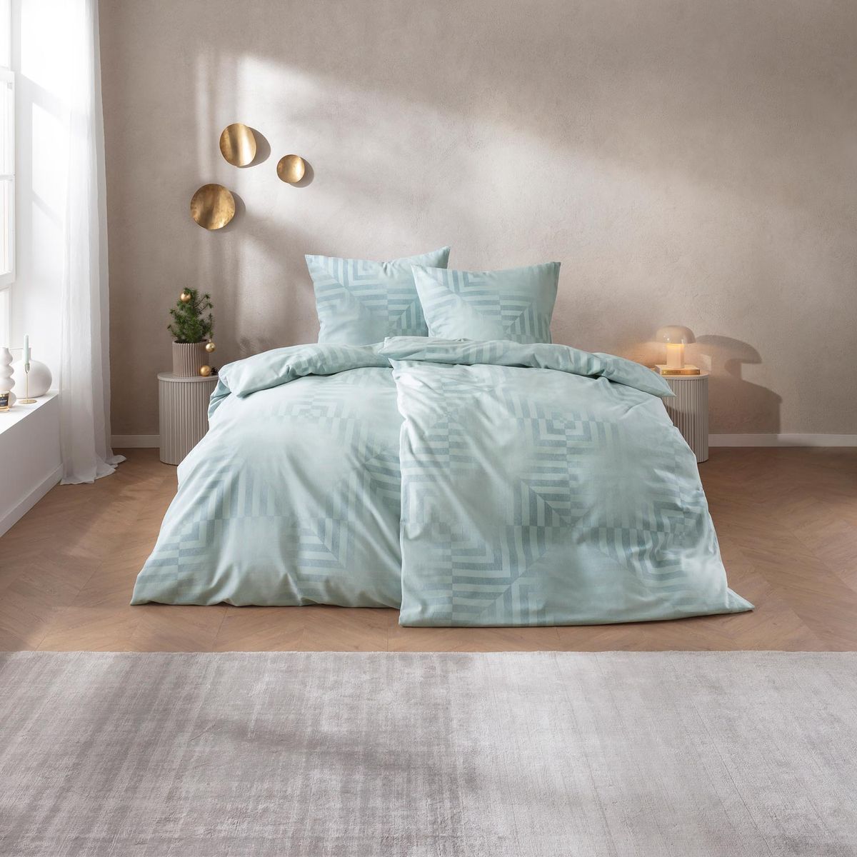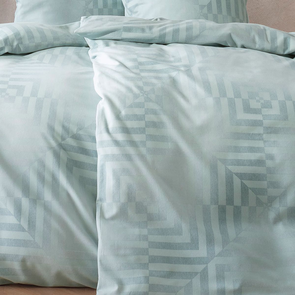 Winterbettwäsche Estella Brunico eisblau mit geometrischem Dessin in dezenter Farbgebung. Warme Flanellbettwäsche aus 100 % Baumwolle, mit Reißverschluss.