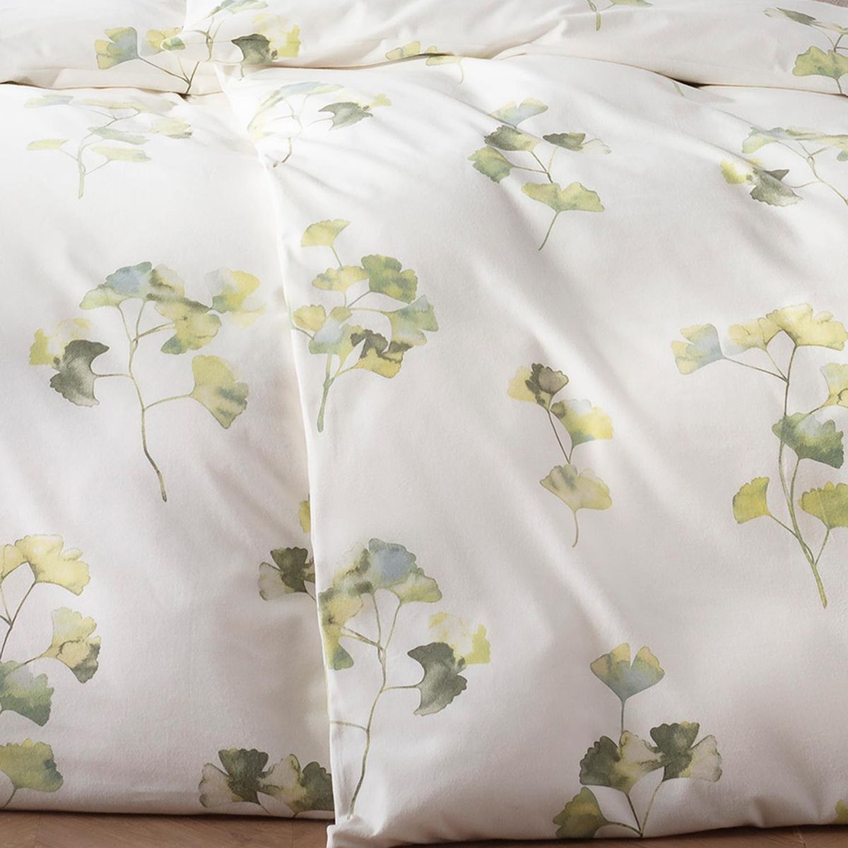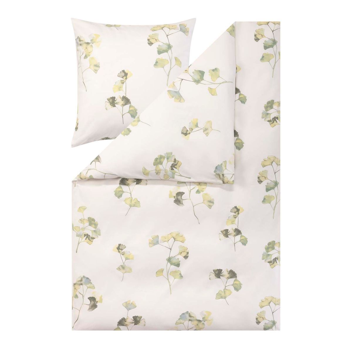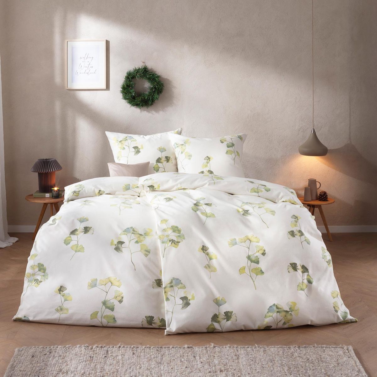 Winterbettwäsche Estella Velturno grün mit Gingkoblätter auf Edelflanell. Schlichtes Dessin mit zarten Blättern. Kuschelweiche, warme Flanellbettwäsche aus 100 % Baumwolle, mit Reißverschluss.