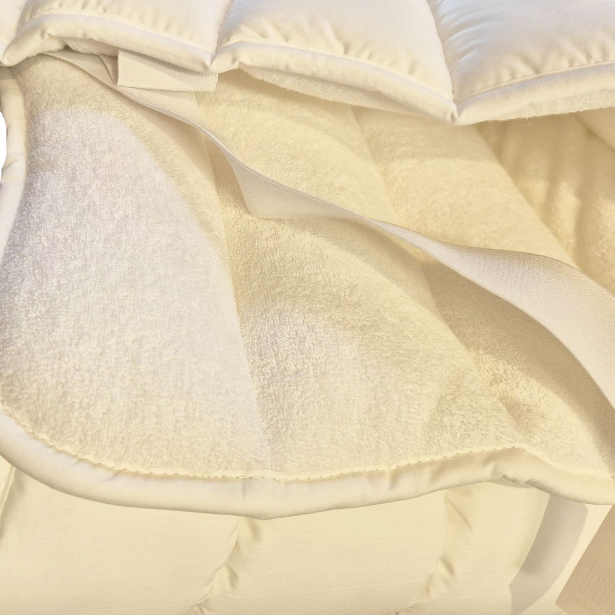 Hochwertige Matratzenauflage mit Füllung aus 100 % Hohlfaser für ein hygienisch frisches Bett. Bezug: Sommerseite Baumwoll-Batist, Winterseite: Frottee. Mit 4 Eckspanngummis. 60°C waschbar.